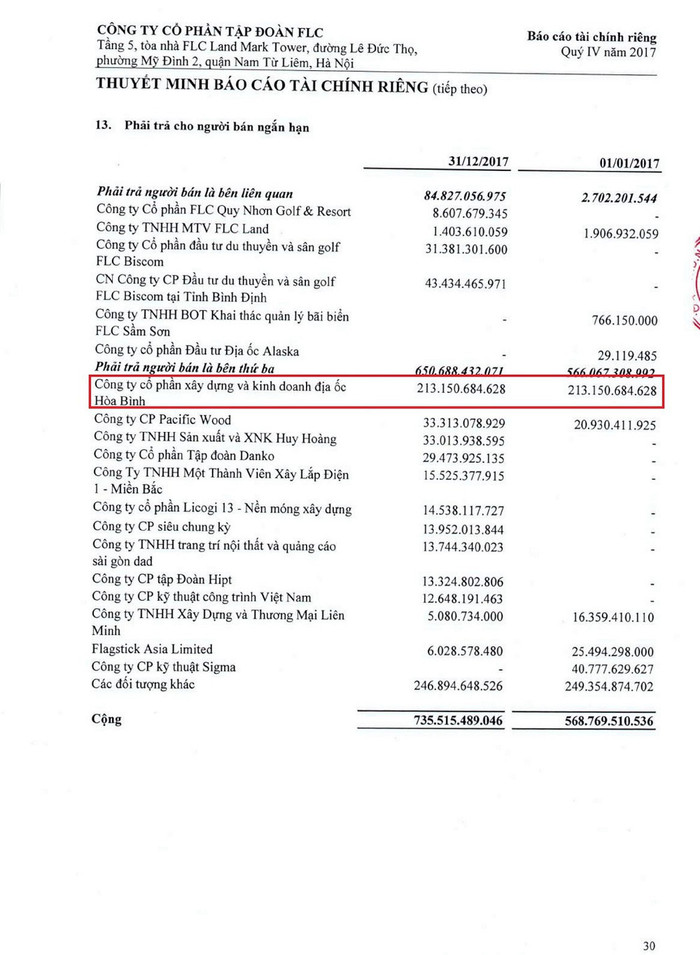 | Báo cáo tài chính năm 2017 của Tập đoàn FLC thể hiện số nợ phải trả cho Tập đoàn Hòa Bình là 13 tỷ đồng. |