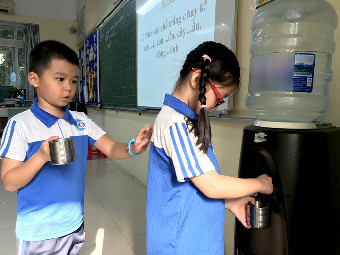 Nước uống sử dụng cho học sinh tại các lớp học đều được nhà trường sử dụng loại nước đóng bình đảm bảo trên thị trường.