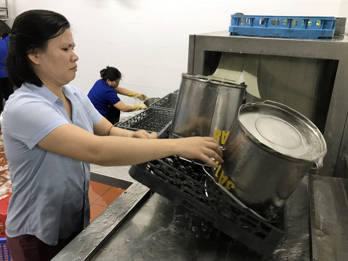 Hệ thống máy rửa và tráng bát bằng nước sôi của nhà trường cũng sử dụng nước đã qua hệ thống lọc của trường.