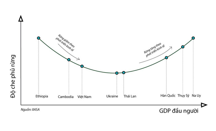 Theo phân tích của IIASA, ở phần lớn các nước đang phát triển, ví dụ như các nước châu Phi, hay Nam Á, càng tăng trưởng rừng càng giảm. Nhưng tới khi vượt qua “điểm cân bằng” - tương đương với mức độ phát triển của Ukraine hoặc Thái Lan - càng phát triển kinh tế, độ che phủ xanh lại càng tăng.