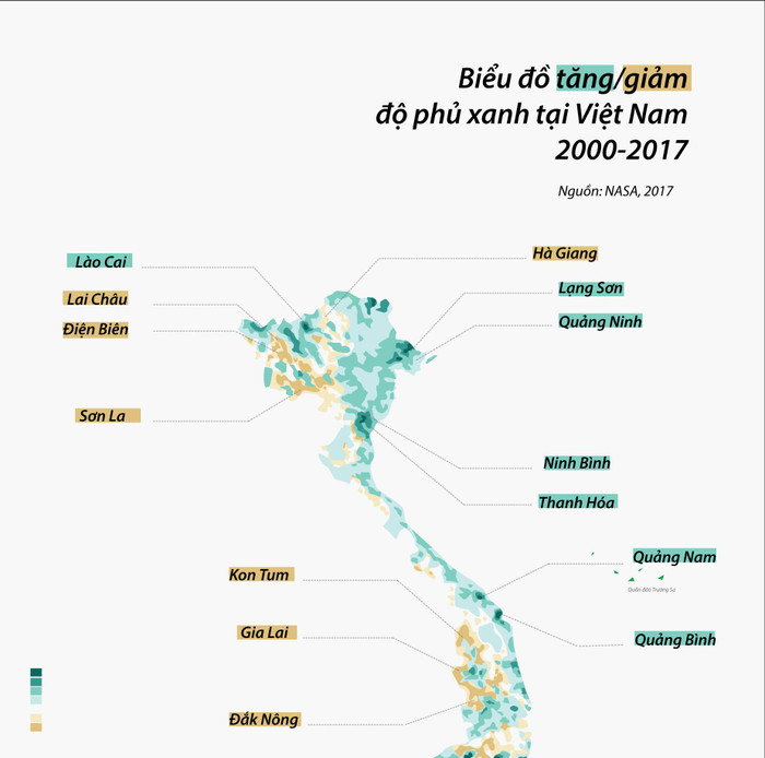 NASA gần đây công bố một biểu đồ đo sự biến đổi cây xanh trên bề mặt trái đất từ năm 2000 tới năm 2017. Các vùng màu xanh thể hiện cây xanh tăng lên, màu nâu thể hiện cây xanh giảm xuống, càng đậm thì tỷ lệ càng cao. Phần lớn vùng Tây Bắc và Tây Nguyên đều mang màu nâu đậm.