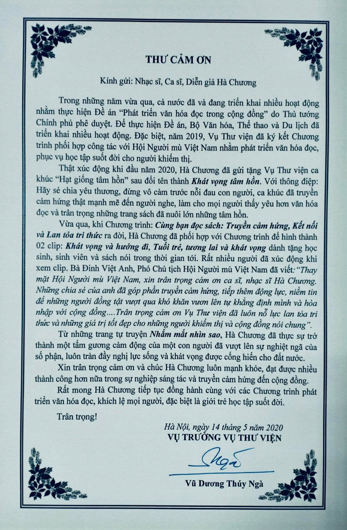 Ngày 14/5 vừa qua, Vụ thư viện gửi thư cảm ơn tới nhạc sĩ Hà Chương như một sự trân trọng và ghi nhận đóng góp của người nghệ sĩ.