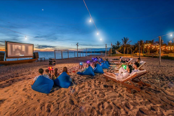 Mỗi tối, rạp phim ngoài trời trên bãi biển hoặc cạnh hồ bơi là không gian trải nghiệm vô cùng lãng mạn và ý nghĩa để các cặp đôi hẹn hò, gia đình quây quần bên nhau với những bộ phim kinh điển.