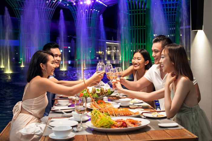 “Tour ẩm thực tinh hoa vòng quanh thế giới” của du khách sẽ thật sự trọn vẹn tại chuỗi nhà hàng đặc sắc nơi đây: Bow Thai (Thái Lan), Bách Giai (Trung Hoa), Chingu (Hàn Quốc), Nhật Bản (nhà hàng Shinko)… hay các nhà hàng chuyên biệt về: hải sản - Ozone, bò beefsteak và bò wagyu hảo hảng - Ruby, câu lạc bộ Beer club…