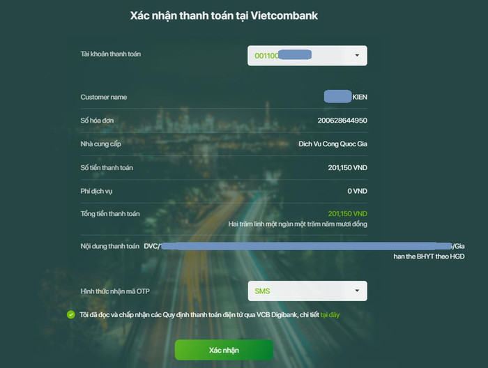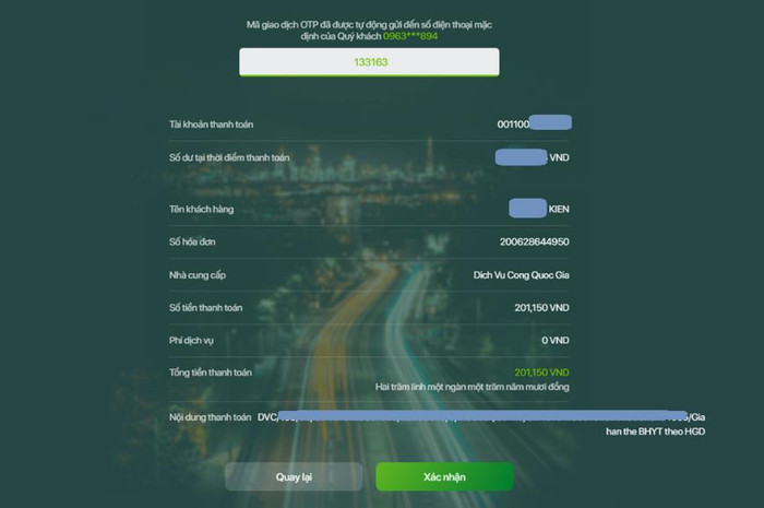 Các thao tác trên giao diện Internet Banking của Ngân hàng bạn thực hiện tương tự như các Bước 6, 7, 8 ở dịch vụ thanh toán Gia hạn thẻ Bảo hiểm y tế theo hộ gia đình.