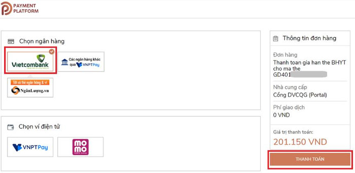 Ví dụ, chọn Ngân hàng Vietcombank rồi click vào nút "Thanh toán".