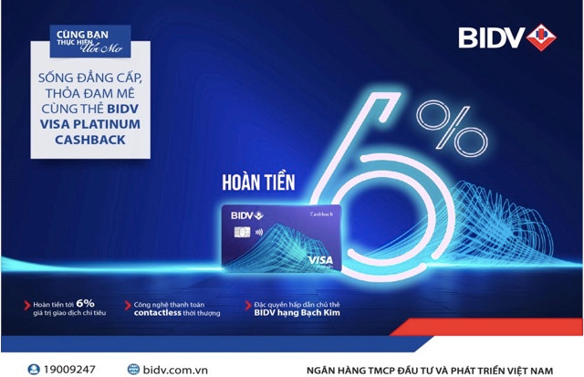 Đặc biệt, với dòng thẻ BIDV Platinum Cashback khách hàng được hoàn tới 6% chi tiêu hàng tháng.