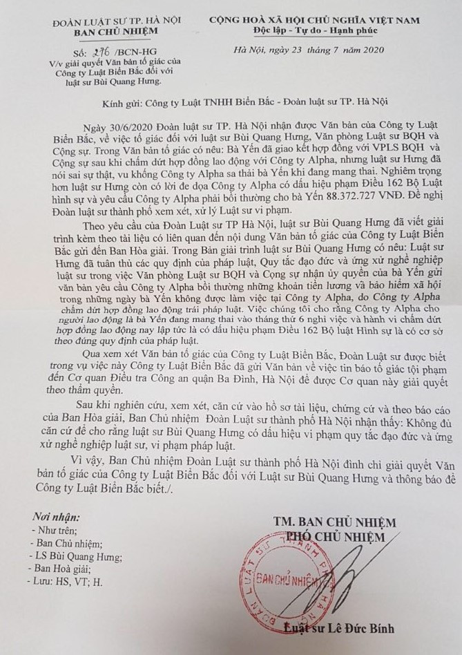Trong văn bản nếu rõ: “Không đủ căn cứ để cho rằng luật sư Bùi Quang Hưng có dấu hiệu vi phạm quy tắc đạo đức và ứng xử nghề nghiệp luật sư, vi phạm pháp luật”.