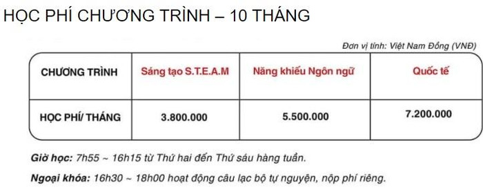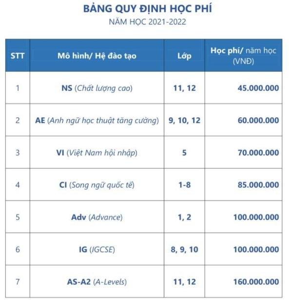 Học sinh theo học chương trình Anh ngữ học thuật tăng cường (lớp 9, 10, 12) đóng 60 triệu đồng/năm. Mức thu đối với chương trình Việt Nam hội nhập (lớp 5) là 75 triệu đồng/năm. Chương trình song ngữ dành cho học sinh từ lớp 1-8 có học phí 85 triệu đồng/năm. Chương trình Advance (lớp 1, 2) và IGCSE (lớp 8-10) có chung mức học phí 100 triệu đồng/năm. Học phí cao nhất thuộc chương trình A-levels - 160 triệu đồng/năm.