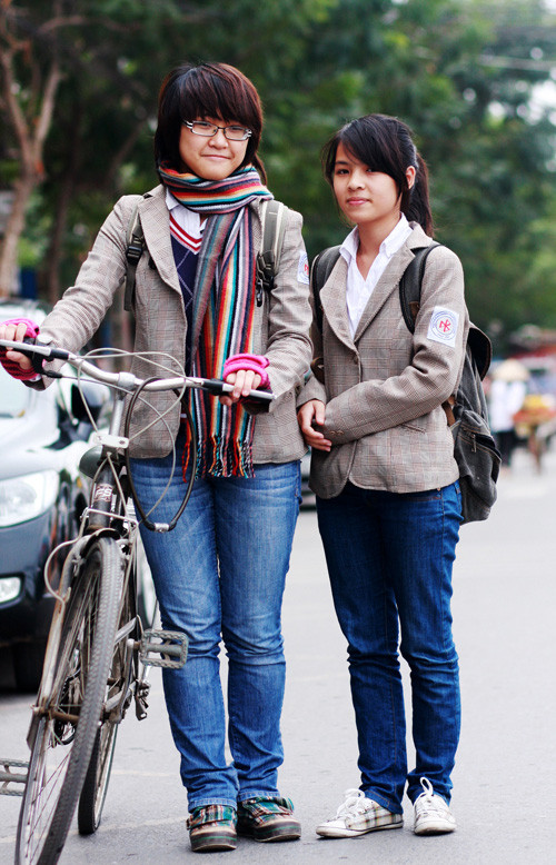 | Đồng phục của trường THPT Nguyễn Bỉnh Khiêm là áo vest màu be, lịch sự và ấm áp, các bạn nữ muốn chút điệu đà thêm chiếc khăn quàng cổ: |
