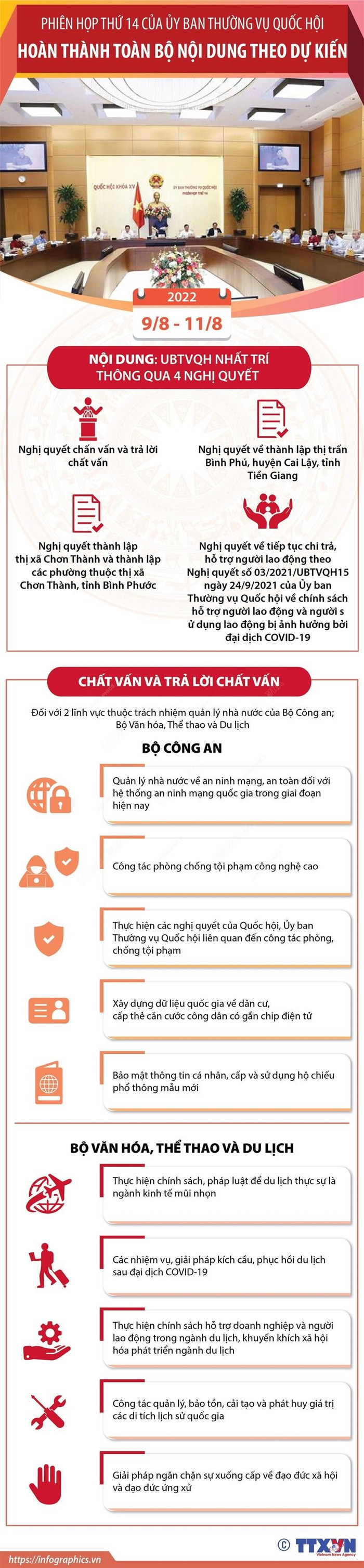Sau 2,5 ngày làm việc, Phiên họp thứ 14 đã hoàn thành toàn bộ nội dung theo dự kiến. Đối với từng nội dung đã được Ủy ban Thường vụ Quốc hội cho ý kiến và biểu quyết thông qua, đã có kết luận cụ thể, Chủ tịch Quốc hội đề nghị Tổng Thư ký, Chủ nhiệm Văn phòng Quốc hội ban hành Thông báo kết luận để làm căn cứ thực hiện.
