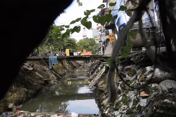 | Rác rến bẩn thỉu ở dưới lòng mương được người dân sống bên trên vớt tạm lên vì nếu tắc nước mương không chảy đi được còn khổ hơn |