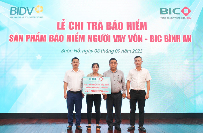 Ngày 08/09/2023, tại thị xã Buôn Hồ, tỉnh Đắk Lắk, Tổng Công ty Bảo hiểm BIDV (BIC) và BIDV Buôn Hồ đã trao hơn 770 triệu đồng quyền lợi bảo hiểm người vay vốn BIC Bình An cho thân nhân khách hàng N.Q.T, không may tử vong do tai nạn lao động.