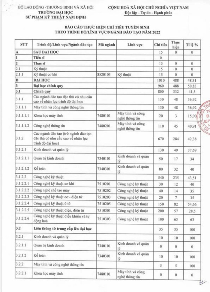 | Năm 2022, số lượng tuyển sinh của Trường Đại học Sư phạm kỹ thuật Nam Định tiếp tục sụt giảm khi chỉ tuyển được 488/1010 chỉ tiêu (48,31%) |