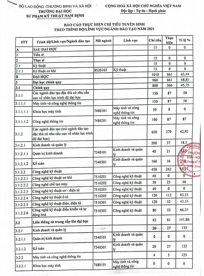 Theo báo cáo thực hiện chỉ tiêu tuyển sinh của Trường Đại học Sư phạm kỹ thuật Nam Định (tỉnh Nam Định), năm 2021, nhà trường tuyển sinh được 661 sinh viên trên tổng số 1010 chỉ tiêu được phê duyệt (đạt 65,44%).