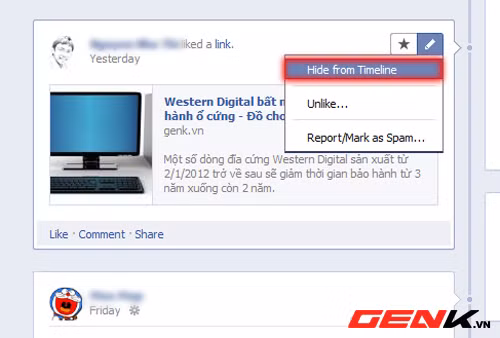Muốn ẩn một hoạt động trên giao diện Timeline, bạn nhấn biểu tượng cây bút tương ứng với hoạt động đó, chọn Hide from Timeline.
