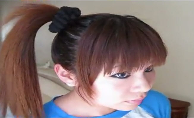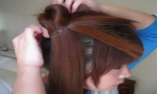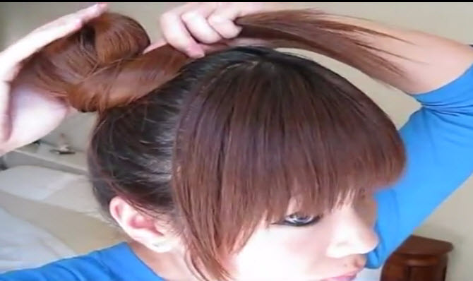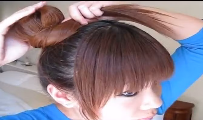 Lấy tay chia tóc làm hai phần. Dùng dây chun buộc lại, sau đó dùng tay tách nhẹ nhàng lớp tóc để tạo thành búi tròn bao phủ và che hết dây buộc tóc bên trong.