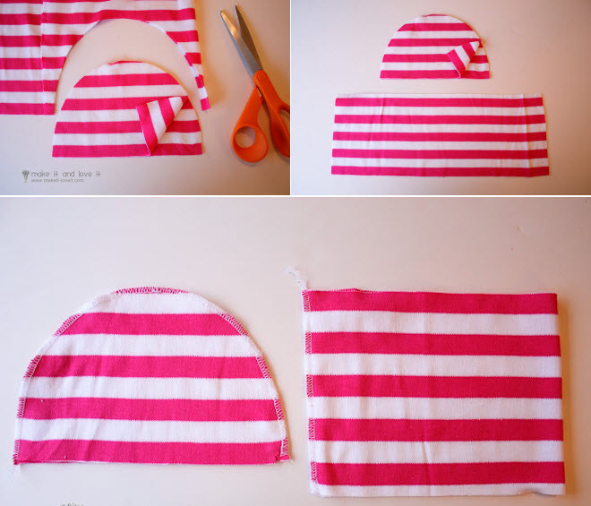 Trải tấm thành 2 lớp trên mặt bàn phẳng. Dùng kéo cắt miếng vải thành hình bán nguyệt vừa đầu bé yêu nhà bạn. Tiếp tục cắt thêm miếng vải hình chữ nhật như trong hình.
