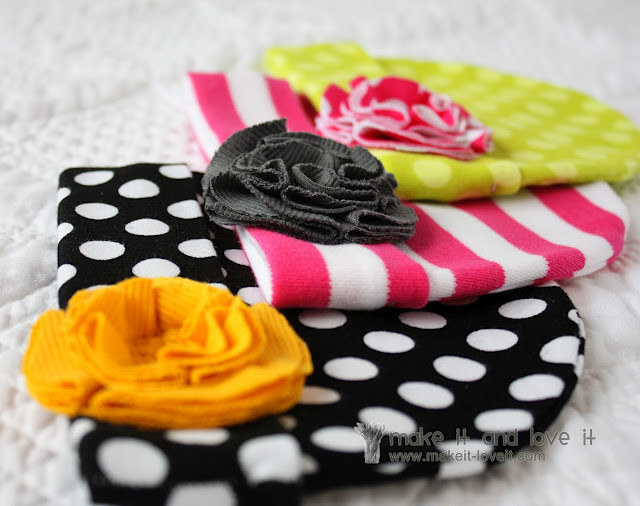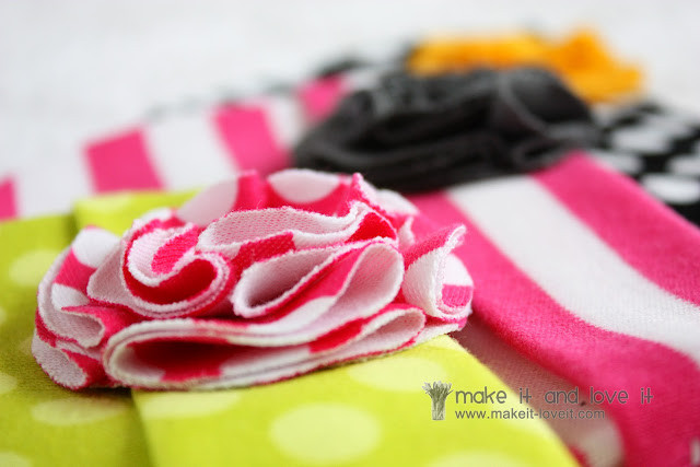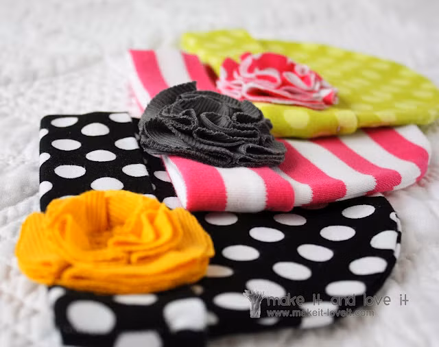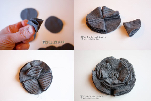 Trên miếng vải tròn lớn, bạn gấp những miếng vải còn lại thành hình cánh hoa và xếp chồng lên nhau để tạo hình bông hoa như trong hình.