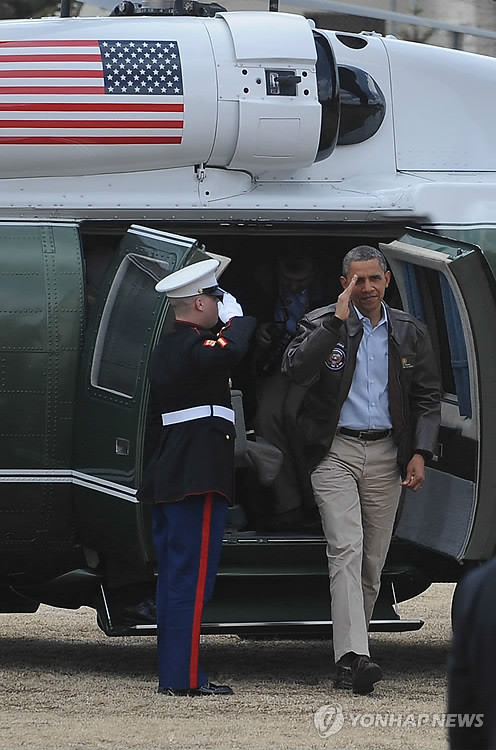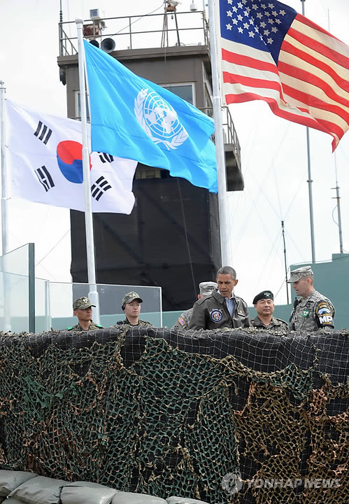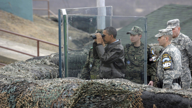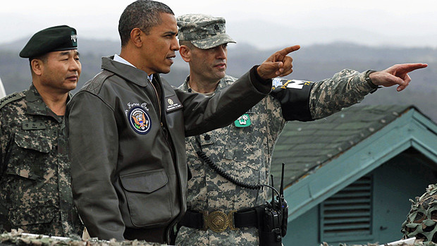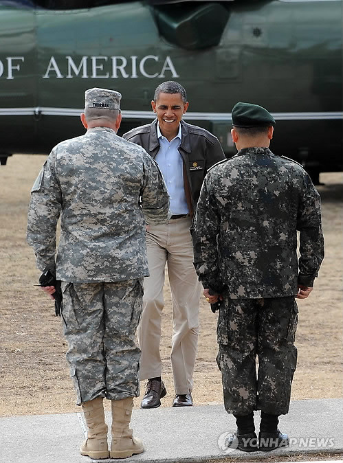 | Đi cùng với ông Obama còn có Tham mưu trưởng Quân đội Hàn Quốc - tướng Jung Seung-jo (trái). |