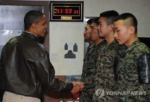 | Trong khuôn khổ chuyến thăm, ông Obama đã có cuộc gặp gỡ và trò chuyện cùng các binh sĩ Mỹ-Hàn đang làm nhiệm vụ tại đây. |