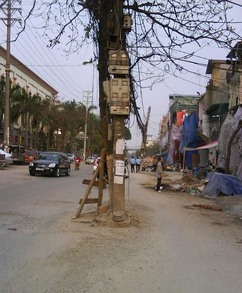 | Những cây cột điện mọc nghênh ngang giữa đường như thế này không phải là điều hiếm thấy trên tuyến đường Nguyễn Khang, Yên Hòa, Cầu Giấy. |