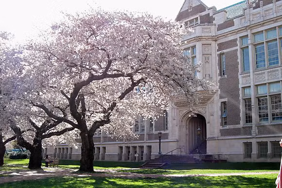 | Những cây anh đào trắng nở rộ dươi thảm cỏ xanh mượt tại Đại học Washington. |