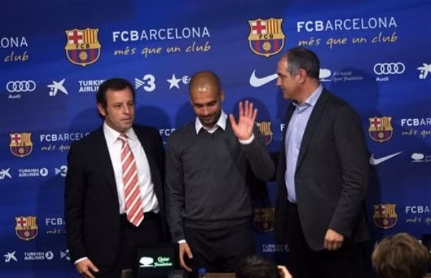 | HLV Guardiola và chủ tịch Sandro Rosell bắt đầu buổi họp báo |