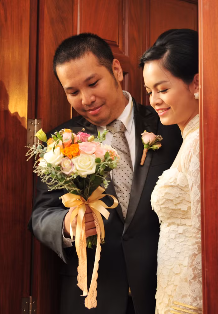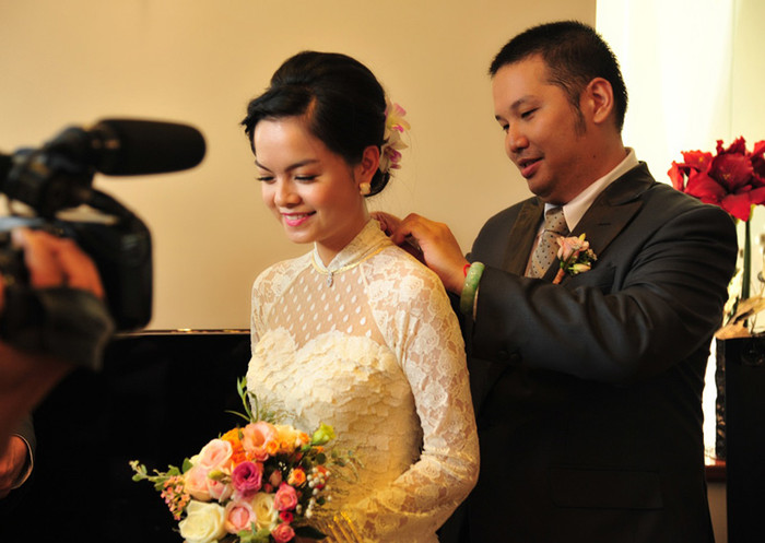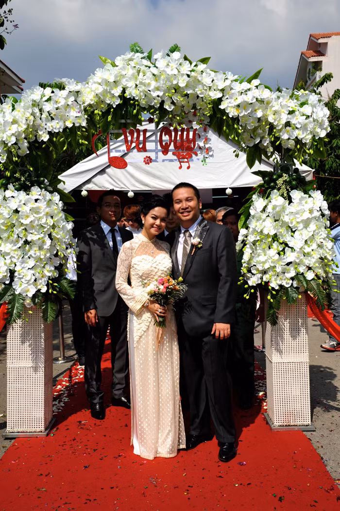 | Trước khi tổ chức tiệc cưới long trọng vào lúc 19 giờ tối tại Riverside Place (TP.HCM), ca sỹ Quỳnh Anh và chồng đã thực hiện nghi lễ đón dâu truyền thống tại nhà riêng vào buổi sáng. |