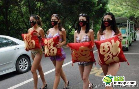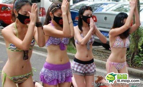 | Bốn cô gái trẻ mặc bikini quỳ lạy trước ảnh của Đức Phật ngay giữa đường trước sự hiếu kỳ của người dân địa phương. |