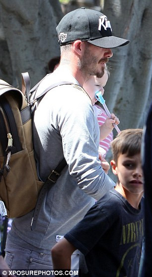 | Becks như thường lệ vẫn bế bé Seven Harper trên tay |
