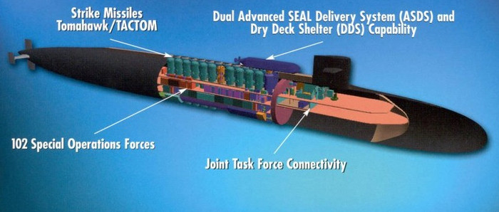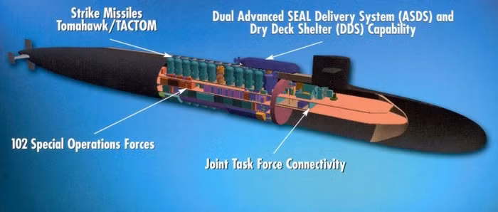 Bên trong tàu ngầm có 4 tầng, có một lò phản ứng hạt nhân. Thủy thủ đoàn là 150 người, trong đó có 66 lính đặc nhiệm của hải quân “SEALS”.