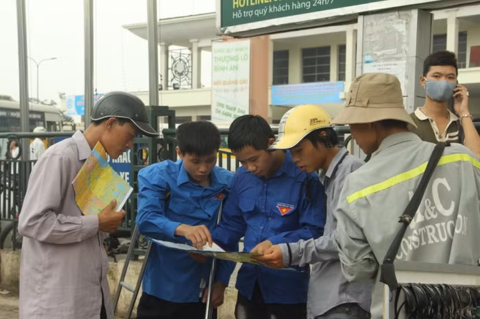| Một phụ huynh trong lúc nghỉ ngơi trò chuyện với sinh viên tình nguyện để tìm chỗ trọ giá rẻ. |