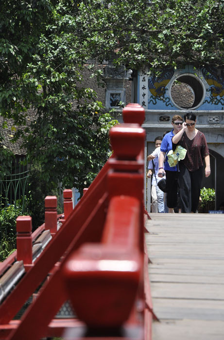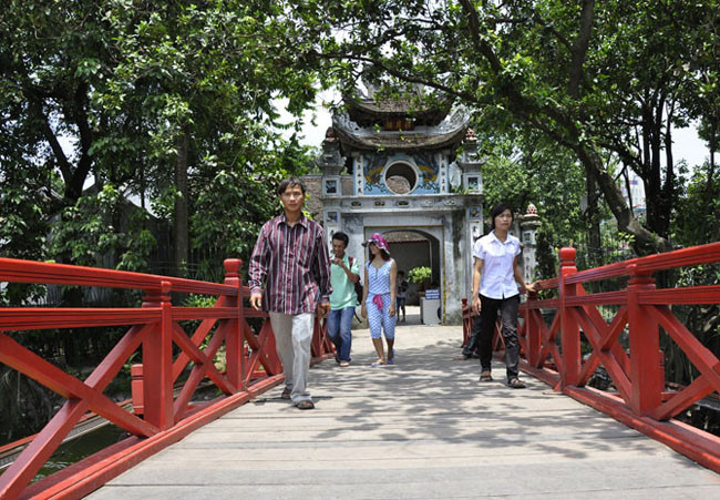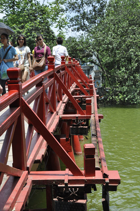 | Du khách phải qua cổng đền Ngọc Sơn đi vào qua khỏi đài Nghiên là cầu Thê Húc. |