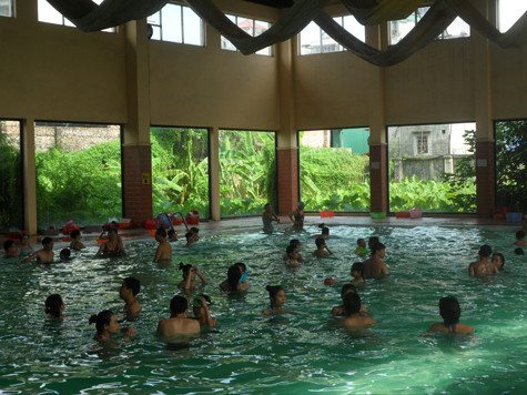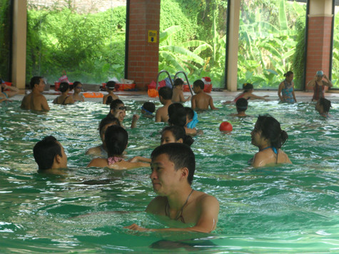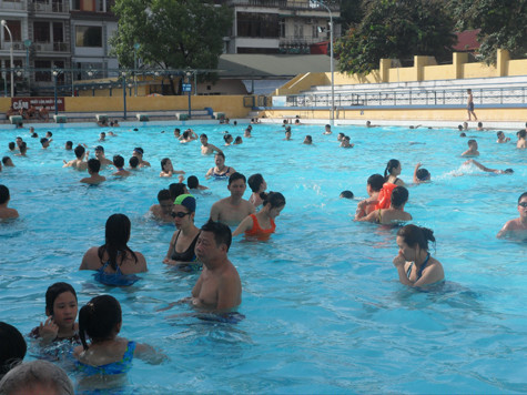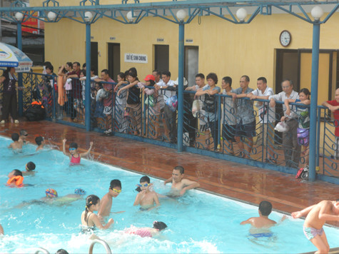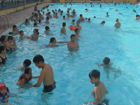 | Nhiều bể bơi lớn tại Hà Nội như bể bơi Thái Hà (Số 5 Thái Hà, Đống Đa), Bể bơi bốn mùa (493 Trương Định, Hoàng Mai),... những ngày này luôn đông nghịt người. |