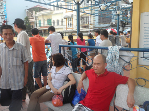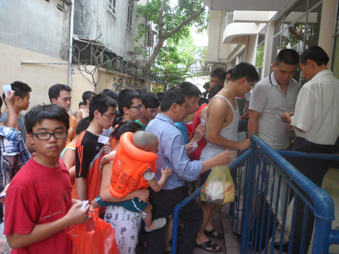 | Lượng khách đổ đến quá đông khiến cho nhiều người phải xếp hàng, chen lấn nhau mới vào bể bơi được. |