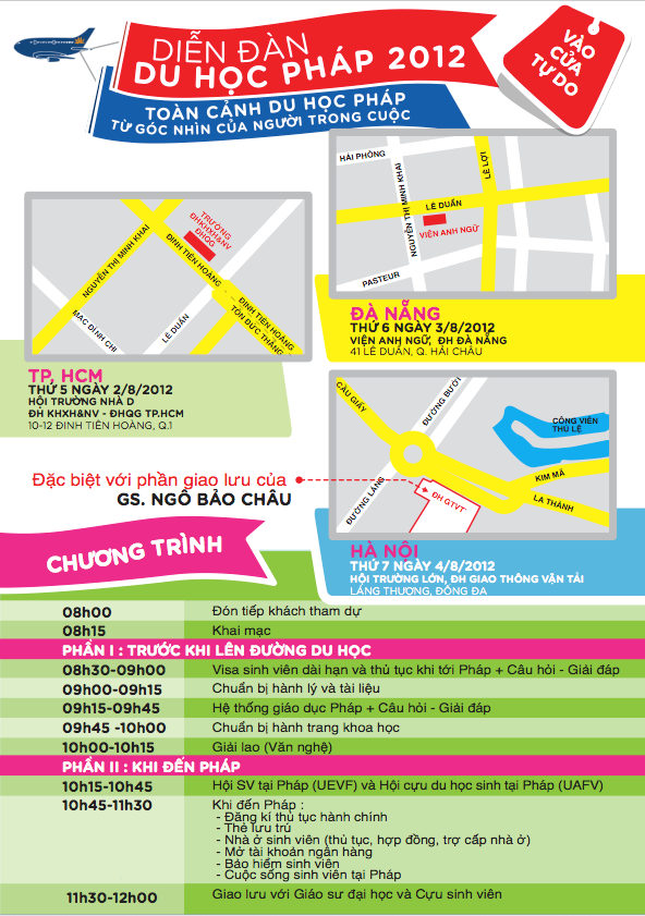 Diễn đàn là thành quả hợp tác giữa Hội Sinh viên và Cựu sinh viên Việt Nam tại Pháp (UEVF&UAFV) kết hợp với CampusFrance – cơ quan chính thức của Đại sứ quán Pháp tại Việt Nam phụ trách mảng du học – và Trung ương Hội sinh viên Việt Nam. Chương trình sẽ diễn ra trong 3 ngày 2, 3, 4/8 tại 3 thành phố lớn: