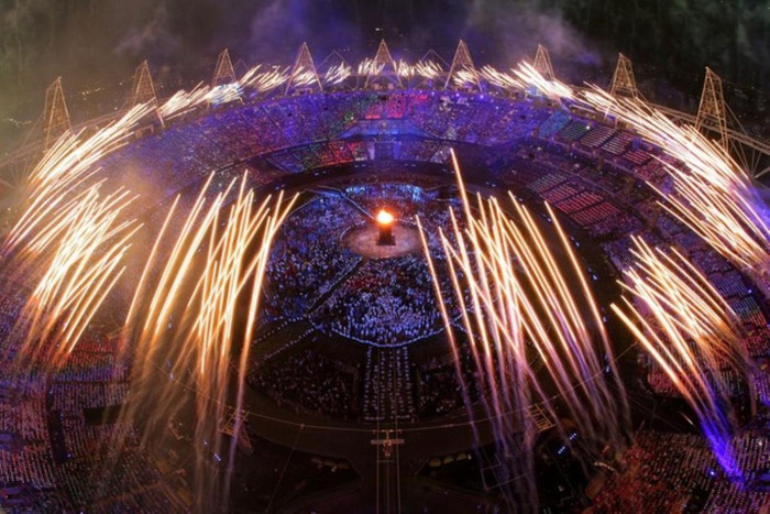 | Đội bay Mũi Tên Đỏ bay qua bầu trời sân Olympic trước lễ khai mạc. |