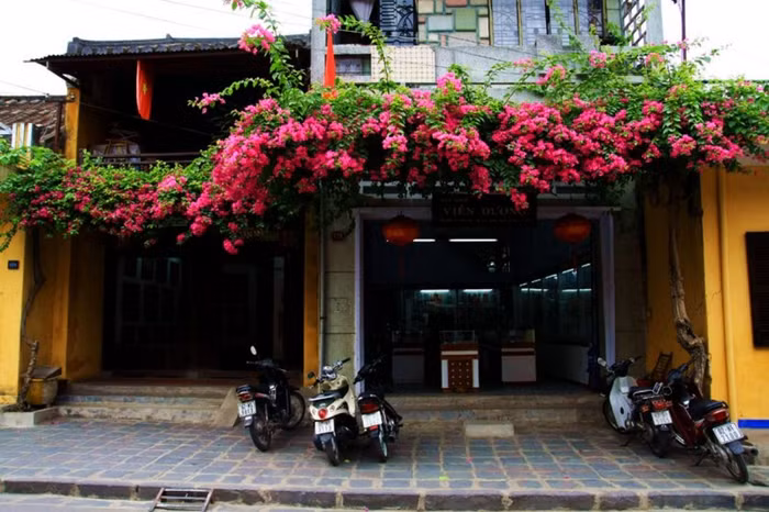 | Những dàn hoa giấy trước cửa nhà với nhiều màu sắc, đằng sau dàn hoa ấy là ngôi nhà cổ bày bán tranh và đồ cổ |