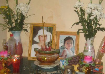 | Bàn thờ và di ảnh hai mẹ con xấu số |