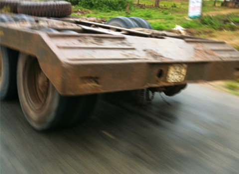 | Xe tải thiếu bánh sau nhưng vẫn chạy. Ảnh: Đoàn Thanh Chung |
