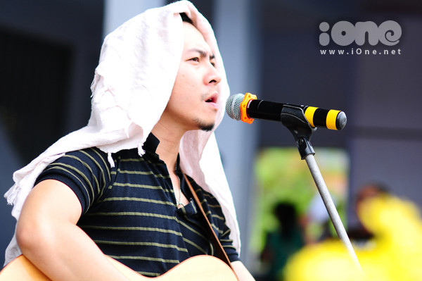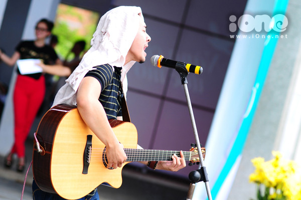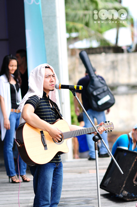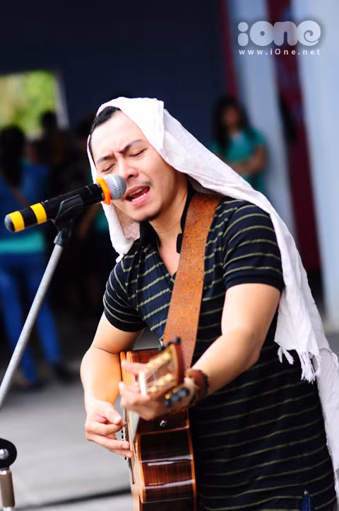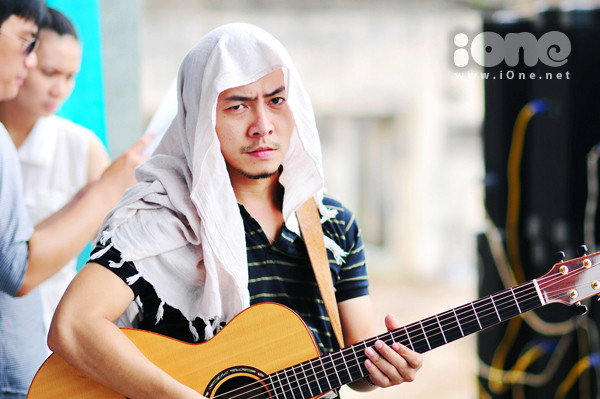 Võ Trọng Phúc trùm khăn, ôm đàn hát giữa trưa