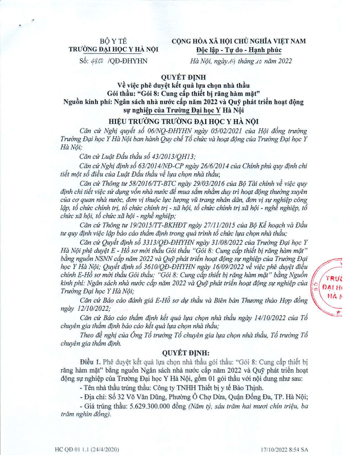 Theo tìm hiểu, đơn vị trúng thầu gói thầu số 8 năm 2022 về "Cung cấp thiết bị răng hàm mặt" của Trường Đại học Y Hà Nội là Công ty TNHH Thiết bị Y tế Bảo Thịnh, với tổng giá trị hàng hóa trúng thầu là 5.626.300.000 đồng.
