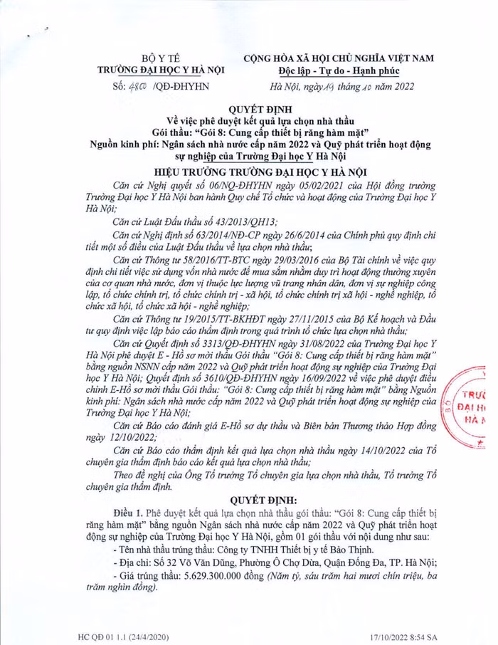 | Quyết định phê duyệt kết quả lựa chọn nhà thầu gói thầu số 8 "Cung cấp thiết bị răng hàm mặt" do Hiệu trưởng Trường Đại học Y Hà Nội Nguyễn Hữu Tú ký. Ảnh: Độc giả cung cấp. |