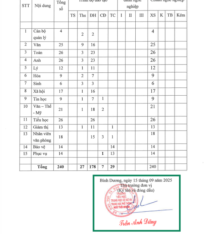 Theo thông tin công khai về đội ngũ nhà giáo, cán bộ quản lý và nhân viên của trường, phóng viên chỉ thấy báo cáo công khai trung học cơ sở và trung học phổ thông, không thấy báo cáo công khai tiểu học.