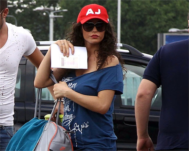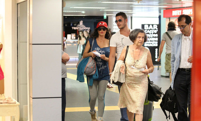 | Xuất hiện ở sân bay Malpensa ở Milan, siêu mẫu Raffaela diện quần bó và áo phông rộng để lộ khá rõ bụng bầu |