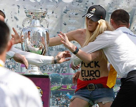 Chiếc Cúp mang tên Henri Delaunay đang được trưng bày ở trung tâm thủ đô Kiev của Ukraine ngày 12/5. Một phụ nữ thuộc nhóm Femen (đây là tổ chức hoạt động nhân quyền bằng hình thức bán khỏa thân) để ngực trần và “trưng” ra khẩu hiểu "F*** Euro 2012" đã lao đến chiếc cup, ném nó xuống đất trước khi ưỡn ngực khoe khẩu hiệu phản đối giải bóng đá vô địch châu Âu. Ngay sau đó, người phụ nữ này đã bị cảnh sát bắt giữ.