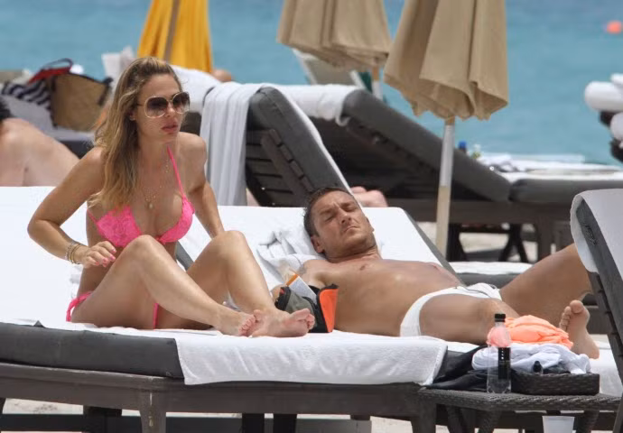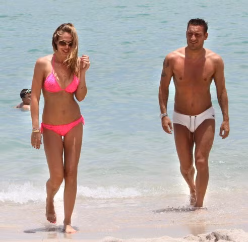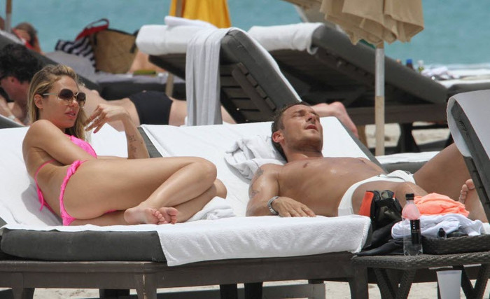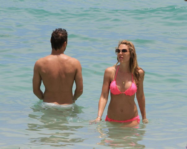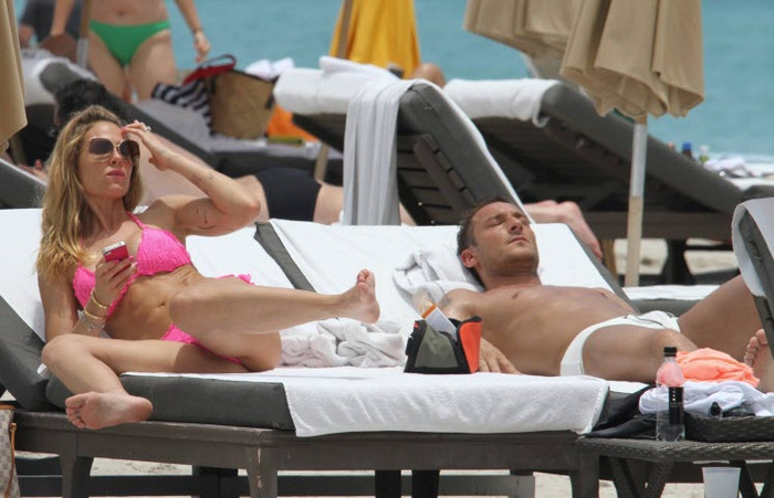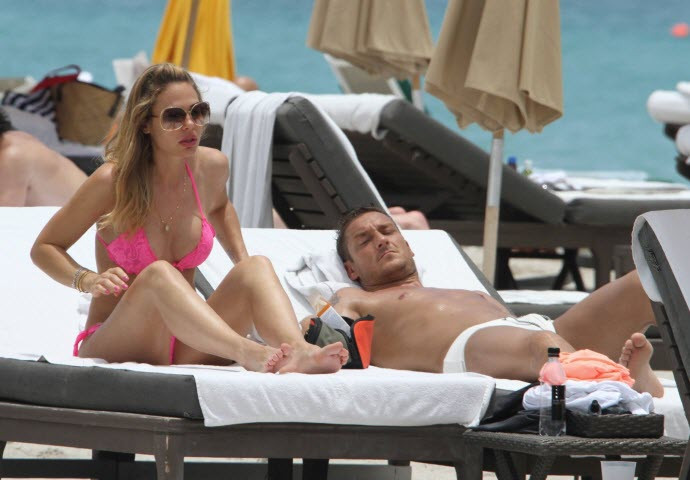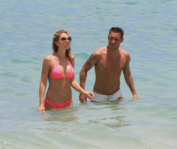 | Bà xã của Francesco Totti xuất hiện trên bãi biển với chiếc bikini màu hồng rất gợi cảm. |