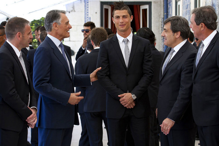 | Các thành viên của đội tuyển Bồ Đào Nha diện kiến tống thống Cavaco Silva, trước khi lên đường sang Ukraine tham dự EURO 2012 |