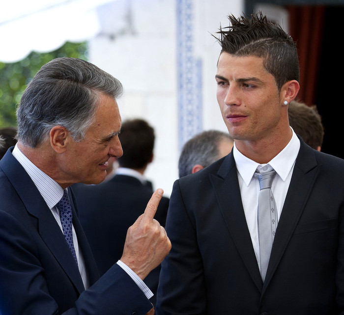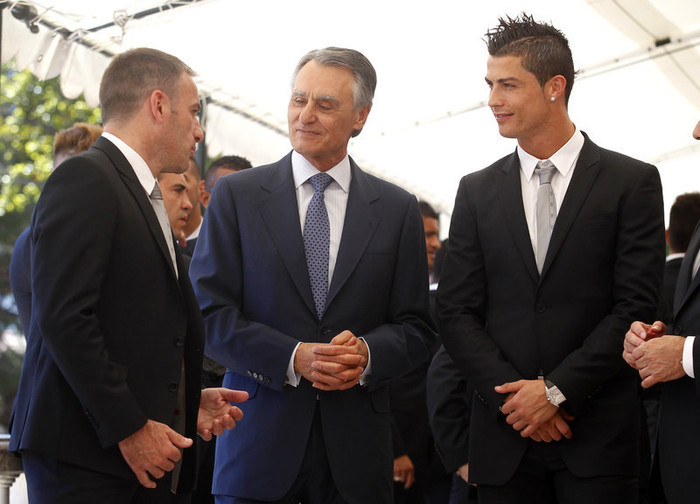 | Cristiano Ronaldo đại diện cho các thành viên trong đội tuyển BĐN nhận chiếc áo may mắn từ tay thổng thống Cavaco Silva, |